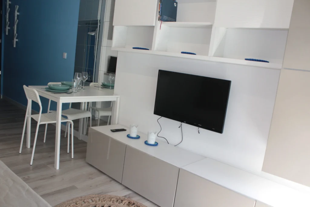 Pokój wyposażony jest w łóżko z materacami z opcją rozłożenia do spania dla 2 osób, stolik + dwa krzesła do spożywania posiłków, mebel segmentowy z szufladami oraz półkami i telewizor na ścianie.