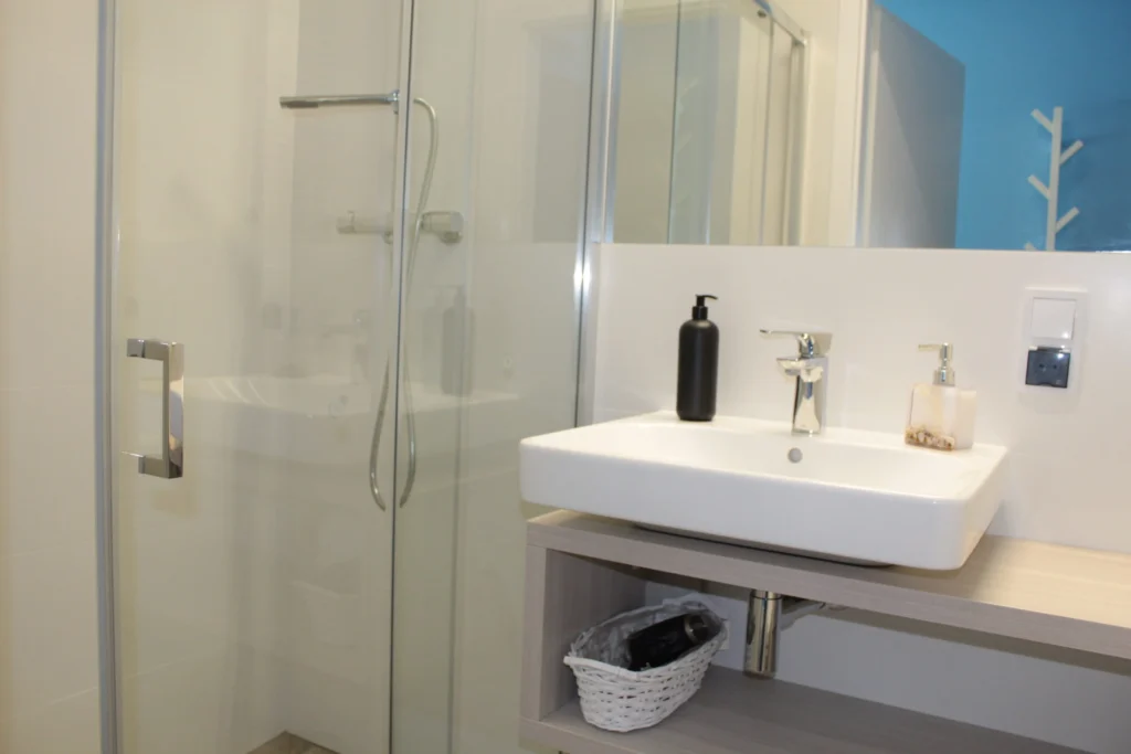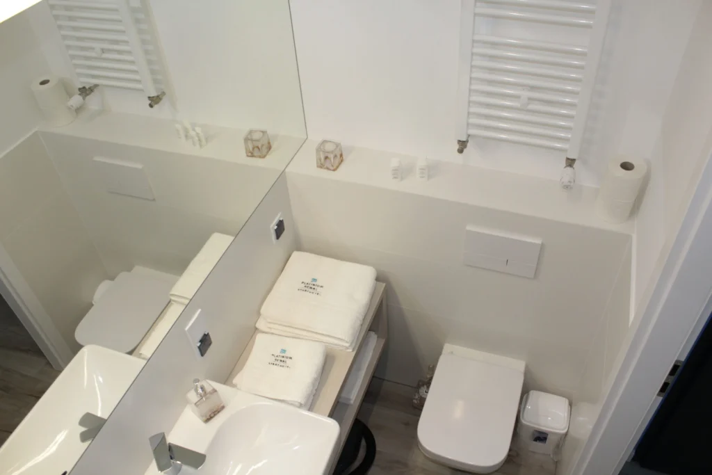 Łazienka – prysznic, toaleta, umywalka, lustro na całej długości jednej ściany